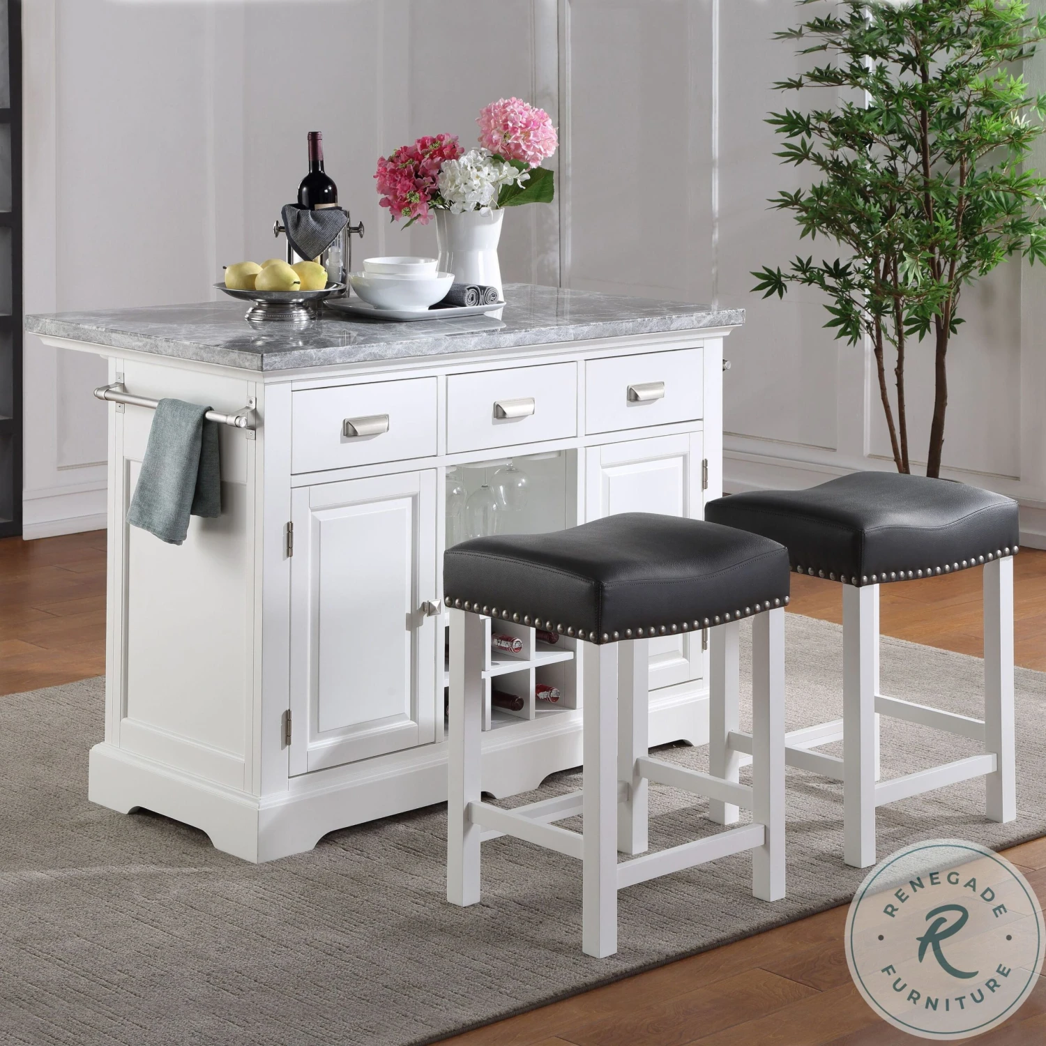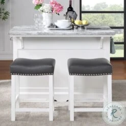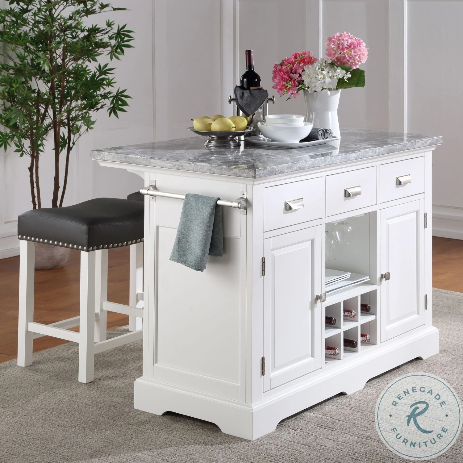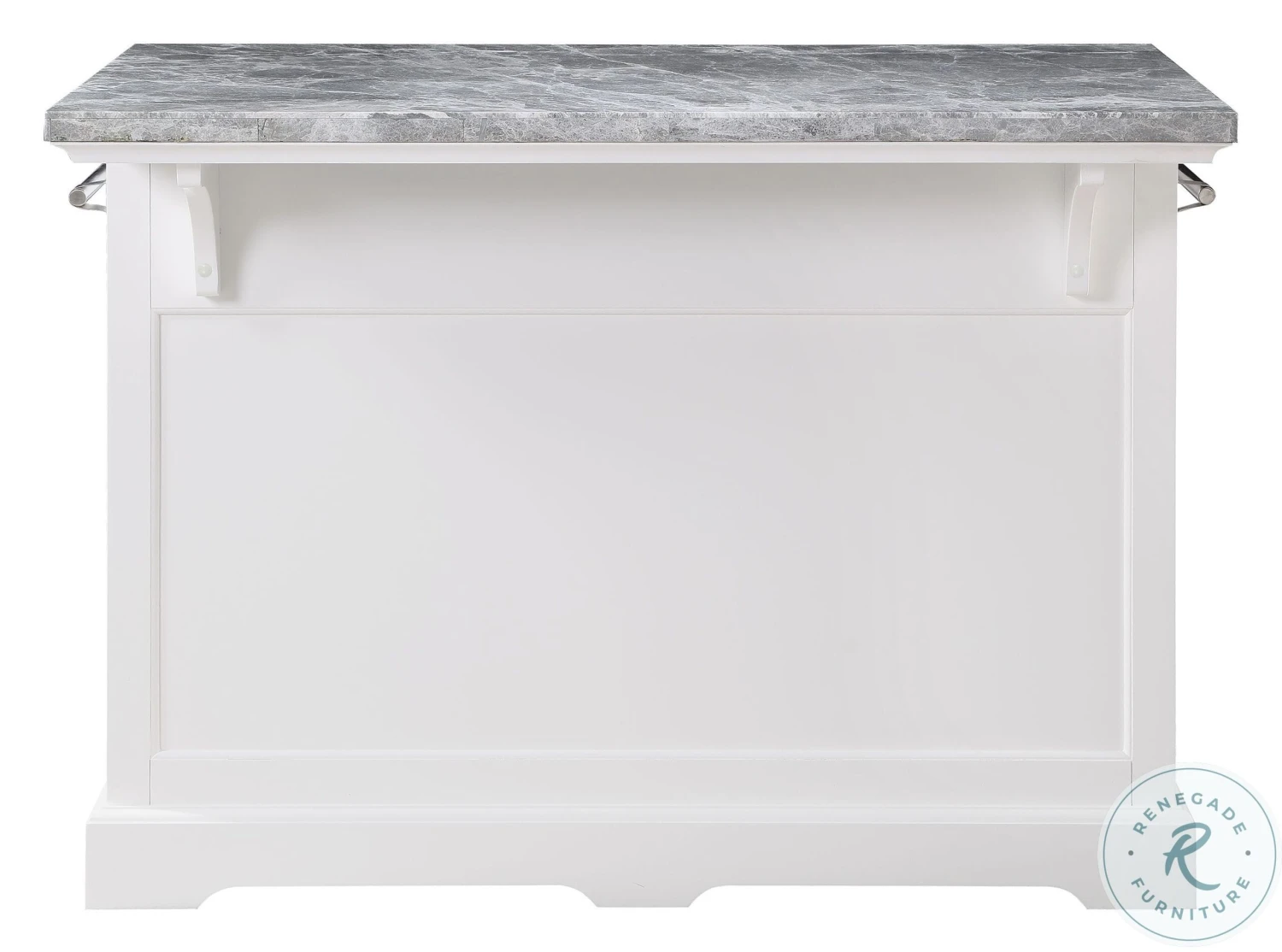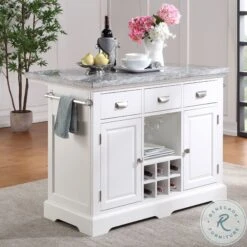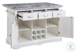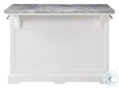 The well appointed Zermatt Grey Marble Top Kitchen Island will be the place to gather in your home for work, dining or just socializing. The clean classic lines fit well in many kitchen decors with beveled door panels, bracket feet and nickel cup hardware pulls. The white base and grey marble top offer a neutral palette to go with the many features including dual towel holders, bottle storage rack, hanging stemware rack and overhang shelf for counter seating. Zermatt is just the update your kitchen has been waiting for. Also available in the collection are coordinating Zermatt Counter Height Stools (purchase separately). Your purchase includes one kitchen island.