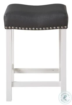 - Stool features comfortable shaped seat, nickel nailhead trim, black faux Leather seat upholstered and stretchers for strength and durability